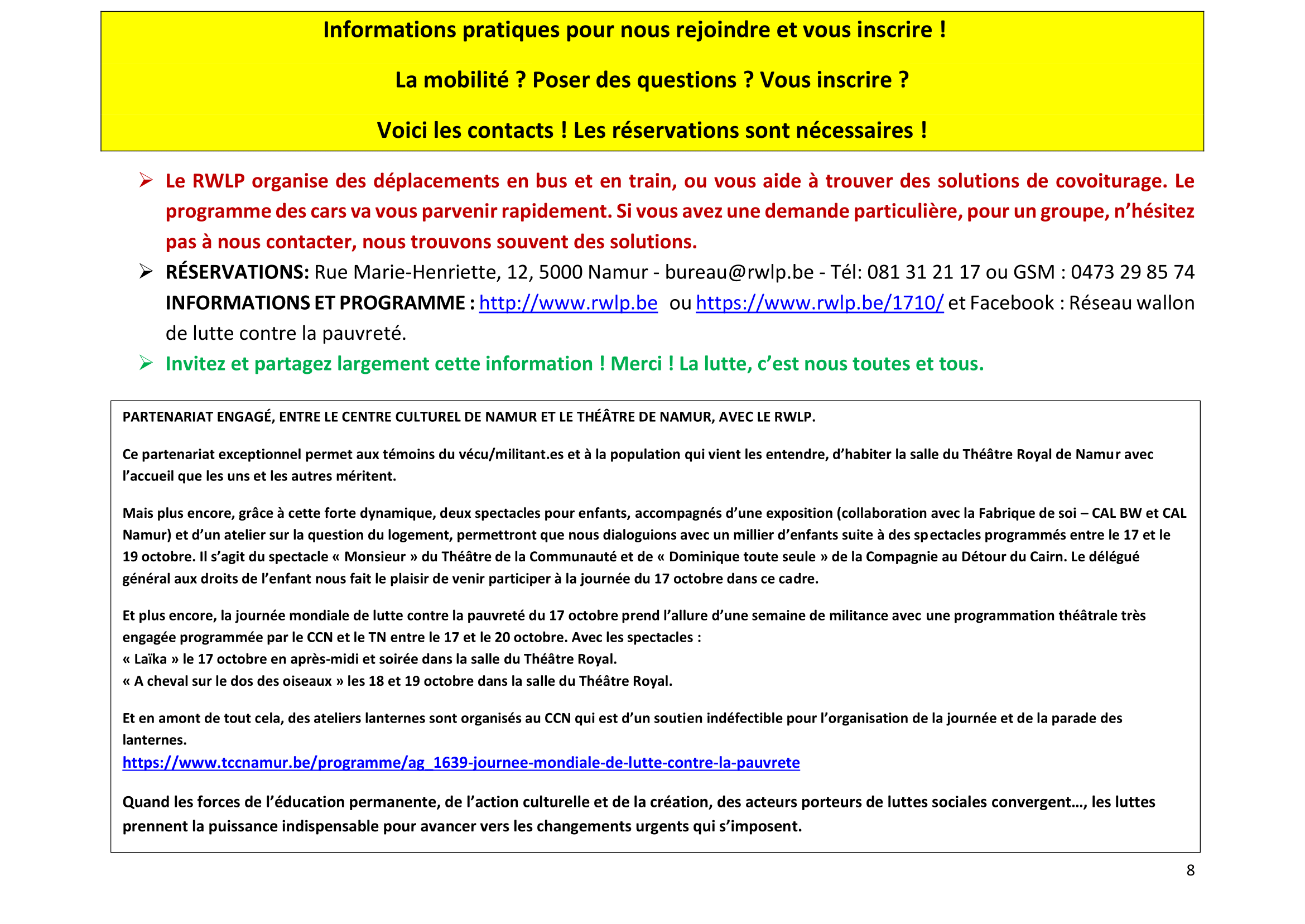 La journée Mondiale de Lutte contre la Pauvreté, ce 17 octobre 223, est organisée avec la collaboration d'un grand nombre d'associations, de collectifs citoyens, de services, les témoins du vécu/militant.es avec le Centre Culturel de Namur et le Théâtre de Namur Avec la mobilisation et le soutien de ...